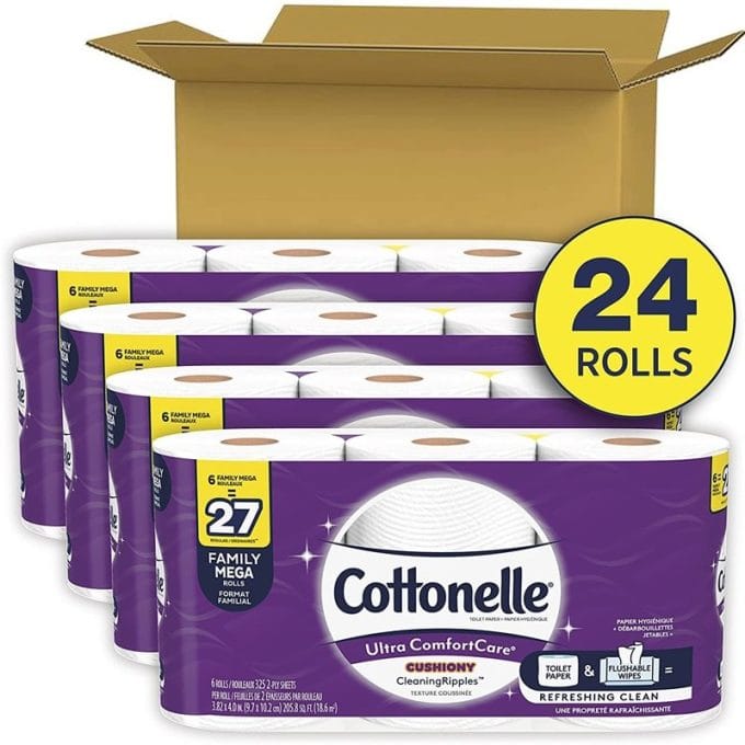 Cottonelle Ultra ComfortCare Cushiony Toilet Paper is soft, 3x thicker, and 3x more absorbent than the leading national value brand*. ComfortCare Cushiony bath tissue is uniquely designed with a soft, cushiony CleaningRipples Texture that removes more at once per sheet with ultimate comfort. This pack contains 24 family mega rolls with 325 sheets per roll. Made with water & renewable, plant-based fibers, it’s biodegradable, clog-safe, septic-safe, and sewer-safe. Cottonelle Ultra ComfortCare toilet tissue is a premium soft, 2-layer bath tissue that contains no harsh ingredients. Pair soft ComfortCare toilet paper with Cottonelle Flushable Wipes for a Refreshing Clean – hypoallergenic and 100% flushable. Cottonelle toilet paper is sourced from responsibly managed forests. Stock up and save by ordering Cottonelle ComfortCare toilet paper in bulk. Packaging may vary from images shown. *Scott 1000 Cottonelle and BLKHLTH partnership: *Colorectal Cancer Alliance and American Cancer Society