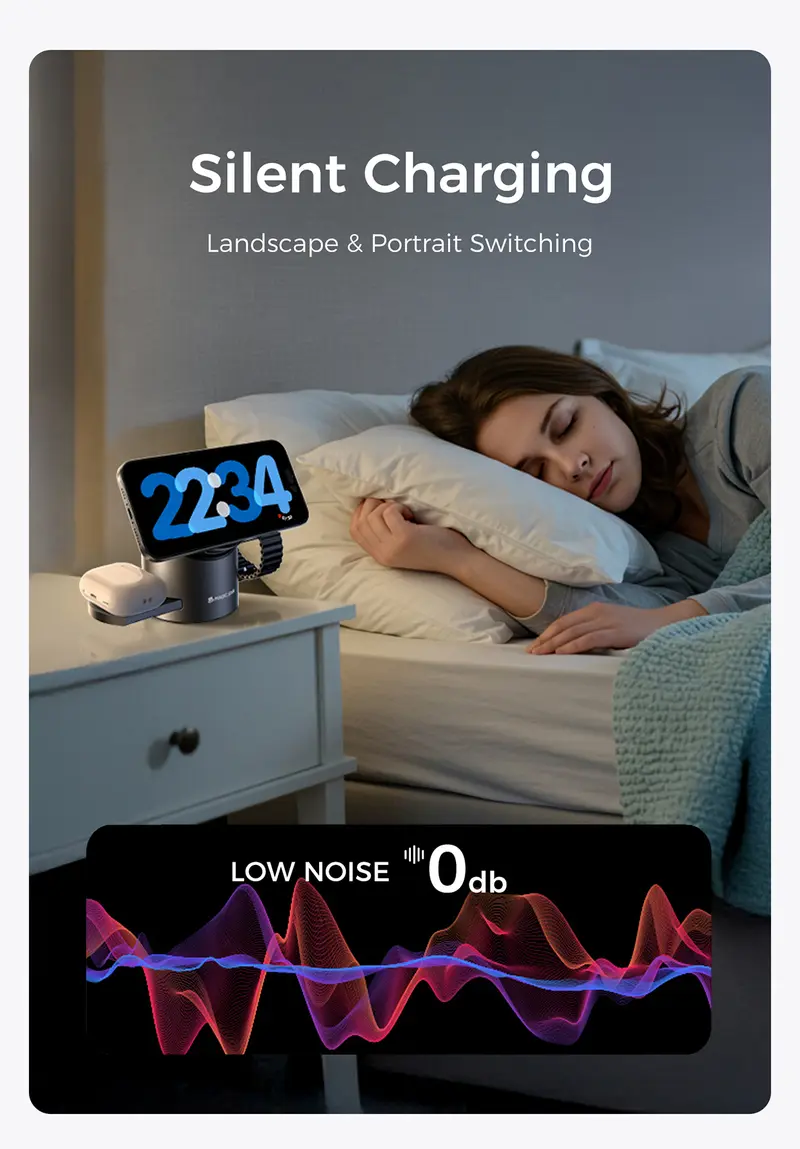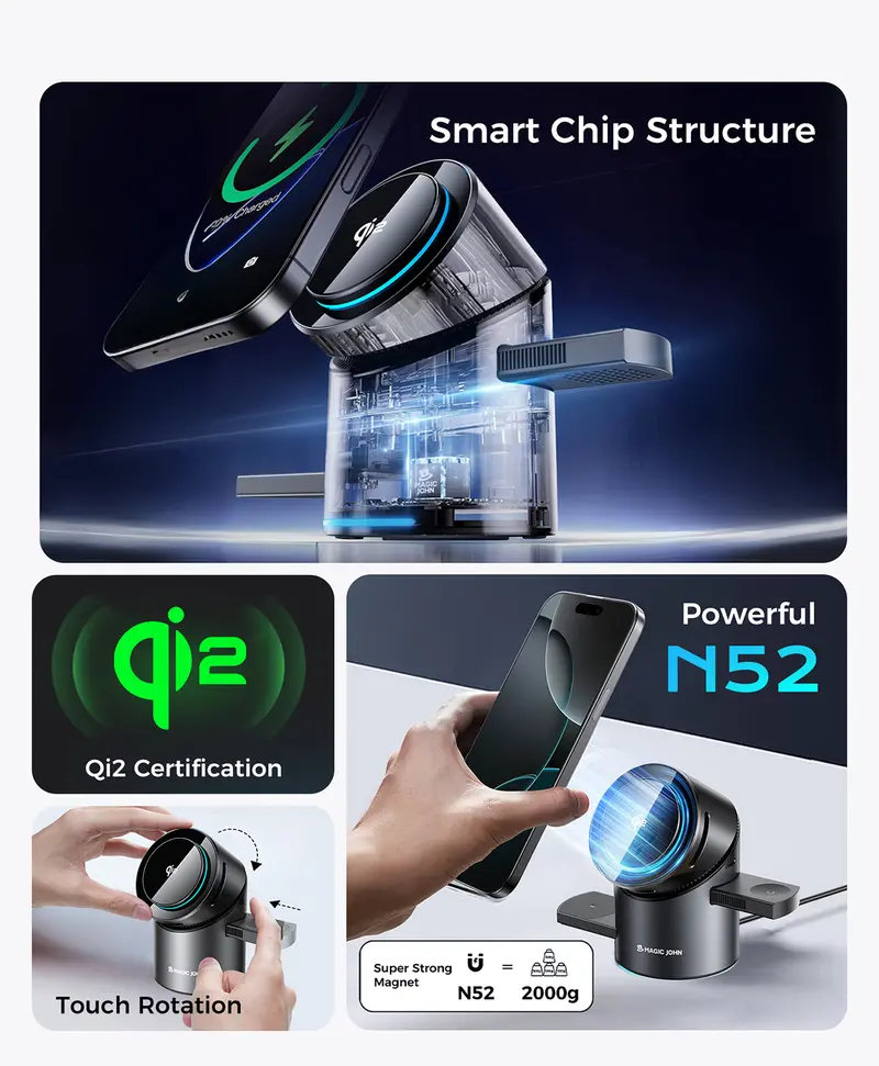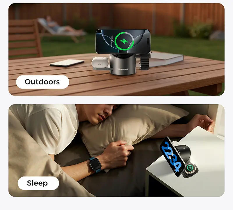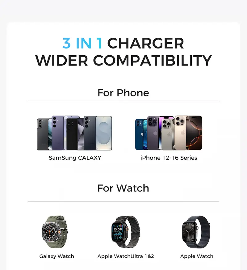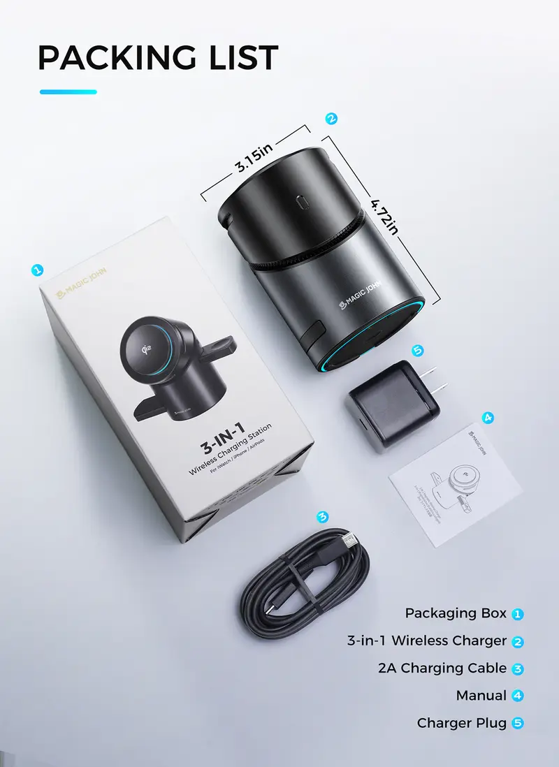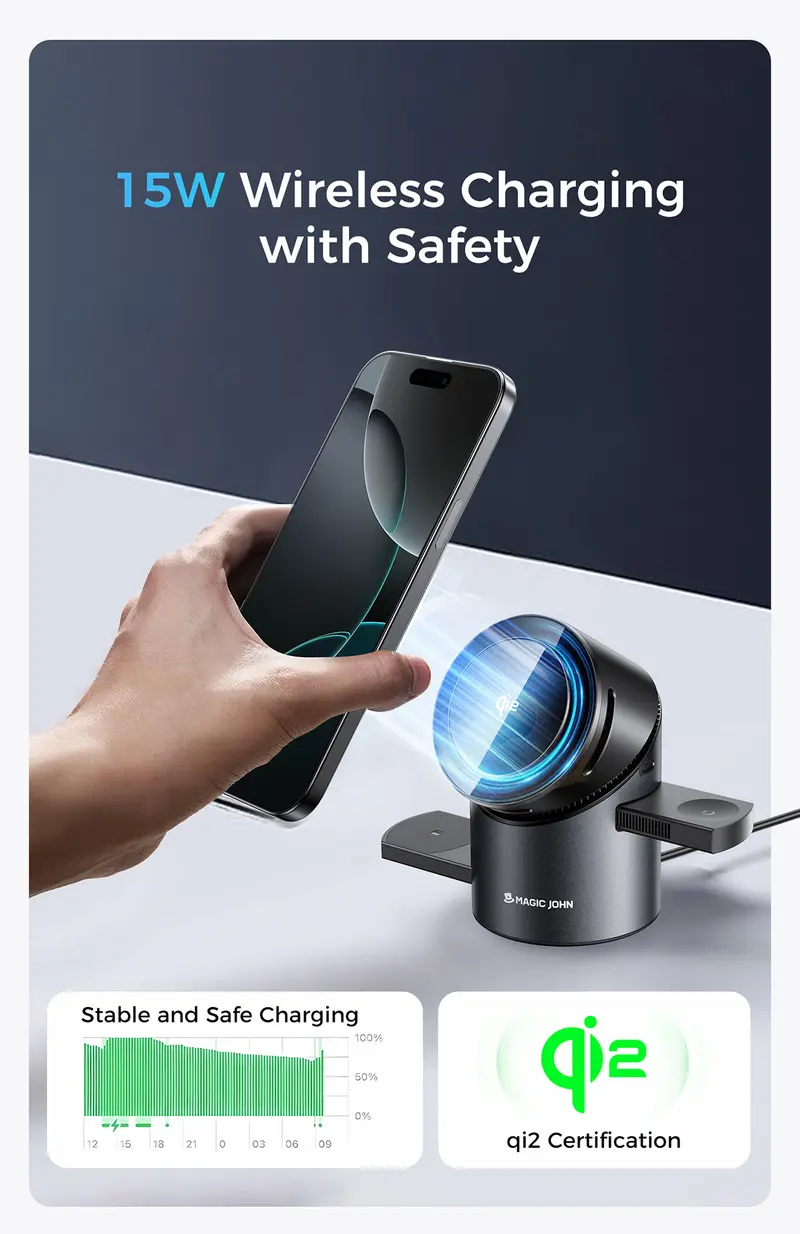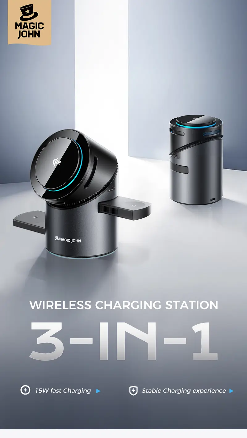 MAGIC JOHN 3-in-1 Wireless Charger Station, Fast Charging Stand for Apple & Samsung,One- Touch Control,One Click Open,Cooling Design, Foldable & Portable Design Wireless Charging Station for iPhone & Samsung Phone &iWatch & AirPods Series